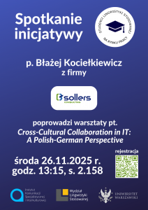 Serdecznie zapraszamy na pierwsze w tym roku akademickim spotkanie inicjatywy „Studenci lingwistyki stosowanej na rynku pracy”! W przyszłą środę o godz. 13:15 p. Błażej Kociełkiewicz z firmy Sollers Consulting (https://sollers.eu/) opowie o kontaktach polskich firm z niemieckojęzycznymi klientami. Warsztaty odbędą się 26.11. o 13:15 w s. 2.158 (II piętro, nowsza część budynku) w języku angielskim. Szczegółowy opis warsztatów i prelegenta poniżej.